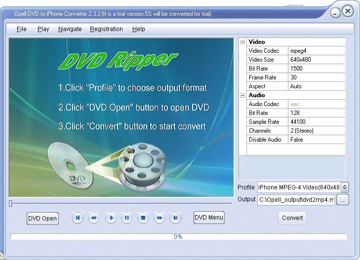 Opell DVD to iPhone Converter is powerful DVD conversion tool for playback on Apple iPhone. It can rip and convert almost any type of DVD to H264, MPEG-4, AVI video format and MP3, WAV, AAC, M4A audio format for Apple iPhone. User interface is very simple and very easy to use. At conversion above 2x faster than other same kind software and without any quality loss. You can enjoy your favorite DVD movies on your Apple iPhone as a portable DVD Player.